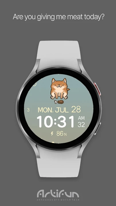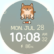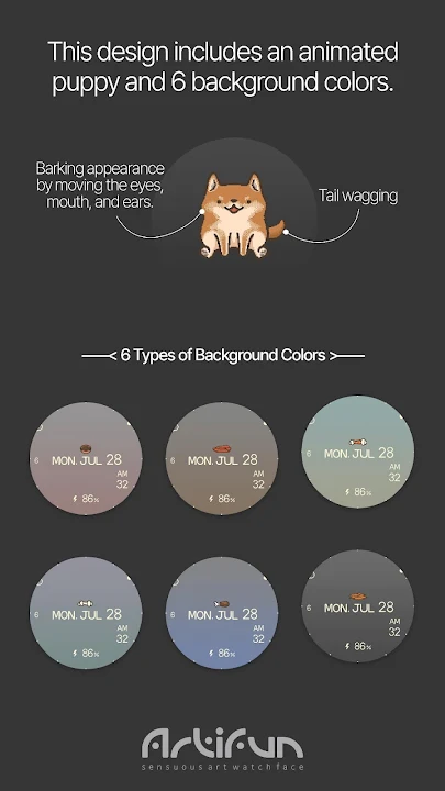 !仅支持圆形表盘!适用于 Wear OS 的数字表盘ㆍ显示:日期、时间、电池百分比ㆍ动画效果:吠叫和摇尾巴ㆍ其他效果:指示小时和分钟的小标记。ㆍ背景颜色 : 从 6 种颜色中选择