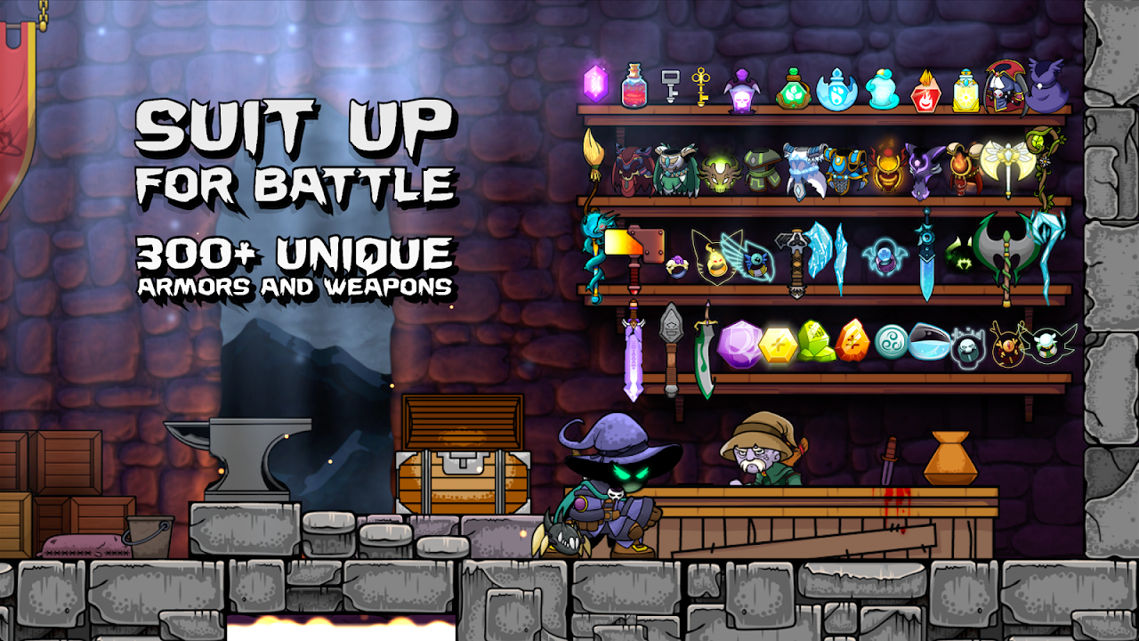 Venture into castles, swamps and forests to fight powerful monsters, giant spiders, dragons, bats, zombies, ghosts, and tough bosses! Choose your class, dress your armor and grab your best weapon among knives, hammers, magical staves, and much more! Find out what happened to the King and uncover the fate of the kingdom!