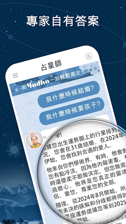 • 富有洞察力的回答。準確的預測只需點擊一下即可達成。通過基於您獨特的出生日期和地點的出生圖,現在和未來將一目了然。