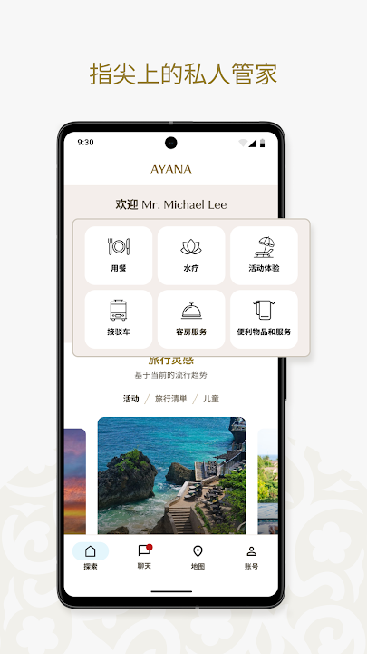在阿雅娜轻松聊天、探索以及预订餐饮、活动和水疗体验。