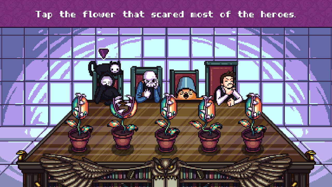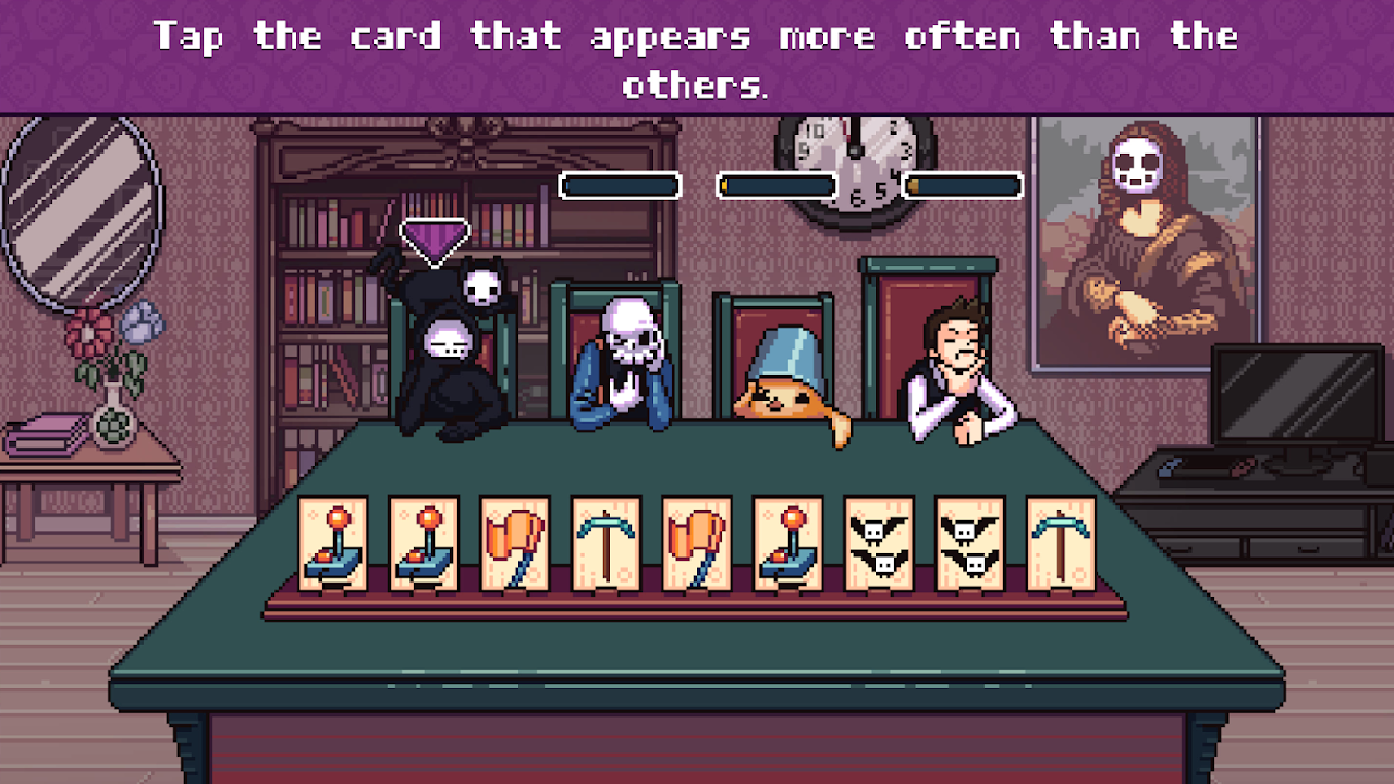 Four characters from different games — Reaper from Peace, Death!, Vladimir from DRAW CHILLY, Knight from OH MY GOD, LOOK AT THIS KNIGHT!, and the Cowboy from Gun Done — sit at the same table and try to think faster than their opponents.