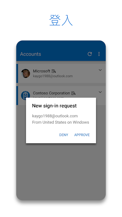 Microsoft Authenticator 可讓您以輕鬆、方便又安全的方式登入。用手機取代密碼來登入您的 Microsoft 帳戶。您只需要輸入使用者名稱,並核准傳送至您手機的通知即可。您的指紋、Face ID 或 PIN 可為您在雙步驟驗證程序中提供第二層保護。您隨後即可存取所有 Microsoft 產品與服務,例如 Outlook、OneDrive、Office 等等。