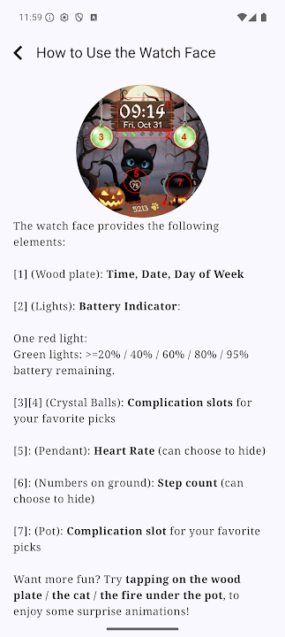 將萬聖節的魔力帶到您的手腕上,讓一位新朋友——一隻神秘的黑貓——在您的 Wear OS 手錶上製造一些樂趣!這不僅僅是一個靜態背景;它是一個生動、互動且可深度個性化的場景,旨在讓您每次查看時間時都露出笑容。