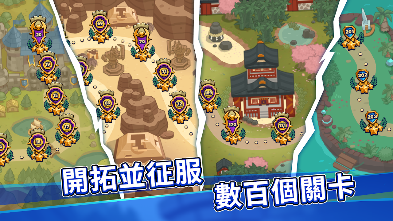 利用我們豐富的力量和能力克服300多個關卡的障礙。成為我們王國先鋒的一員,你將穿越茂密 的森林、積雪覆蓋的山脈和史詩般的沙漠,同時運用你自己的戰略來對抗敵人!機會無窮無盡: 你將監督建設一支英雄隊伍,發現秘密挑戰,並升級你的塔樓!