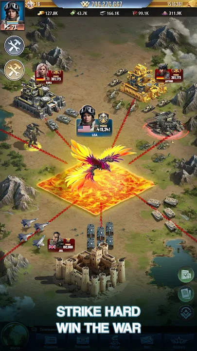 Develop strategies, employ military tactics, join alliances, upgrade energy sources, and deploy chemical weapons to defend your base effectively. Strategize to conquer bases with various weapons, including missiles, and command your army to destroy enemy nations and expand your territory.