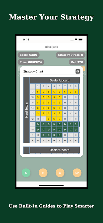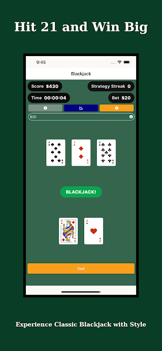 無論您是新手還是想要成為職業玩家,這款應用程式都能幫助您學習每手牌的最佳策略。使用真實的二十一點規則進行練習,自訂設置,並獲取智慧提示,了解每一步操作的最佳原因。