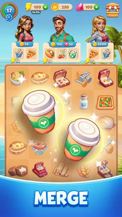 Merge, rebuild, and uncover hidden stories in a sunny travel beach town!