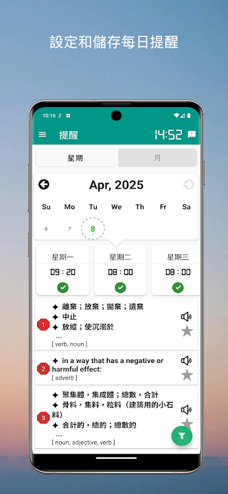 顯著特點: ✓ 迷你多語言詞典 ✓ 多種條件過濾單詞列表(學習,標記,短語,後綴) ✓ 多種練習類型(測驗,寫作,拼圖,排列,相同 mean) ✓ 每天提醒✓ 使用主屏幕小工具快速學習單詞 ✓ 免費在線檢查語法 ✓ 練習歷史幫助用戶以後復習