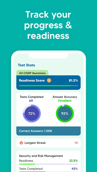 Additionally, our mobile app provides a personalized study plan based on your skill level, study frequency, and target test date. Not sure when you want to take the exam? You can adjust your study plan as often as you like. Our proprietary readiness score will help you determine when you’re ready to take the real exam and pass with a high score on your first try.