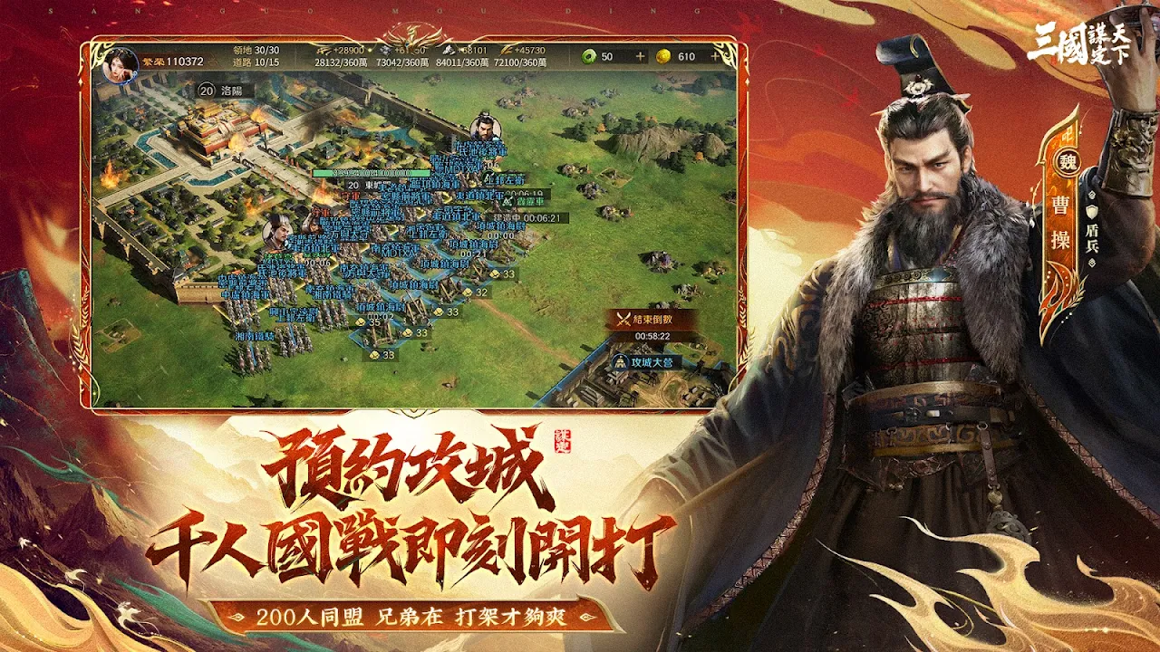 三國戰場大革新!在這個真實磅礴的三國世界中,千百場戰役正在各處角落發生。你可以加入200人的同盟,跟兄弟們一起,運籌帷幄、排兵佈陣、操控投石車與衝車等古代攻城器械,計算出最佳的進攻路線、撕裂敵陣防線,一路血戰奪城!我們還為日理萬機的主公們準備了「一鍵預約攻城」功能,從此不再錯過每一場精彩的戰役!