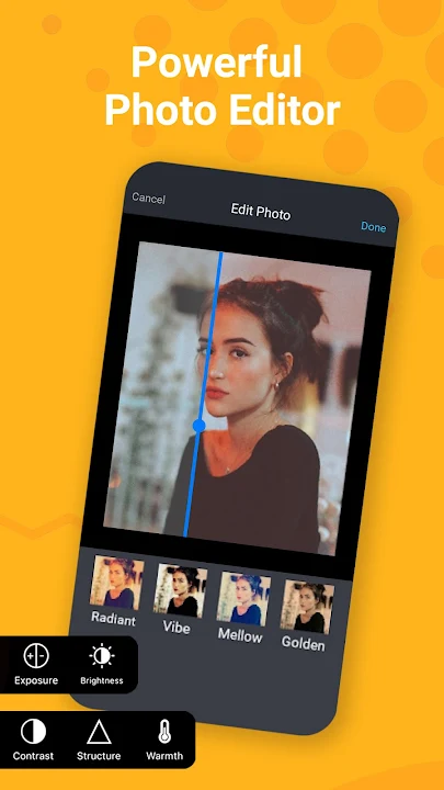 – Effects: exposure, brightness, contrast, structure, warmth, saturation, fade, highlights, shadows, vignette, sharpen