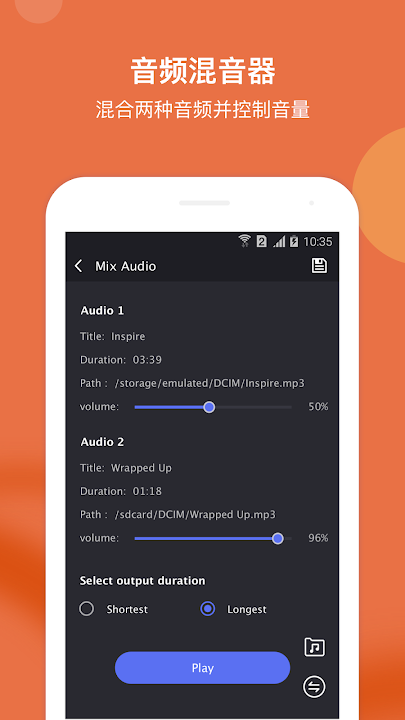 - 音频混合:您可以将两首音乐混合成一首,还可以调整音乐的音量。
