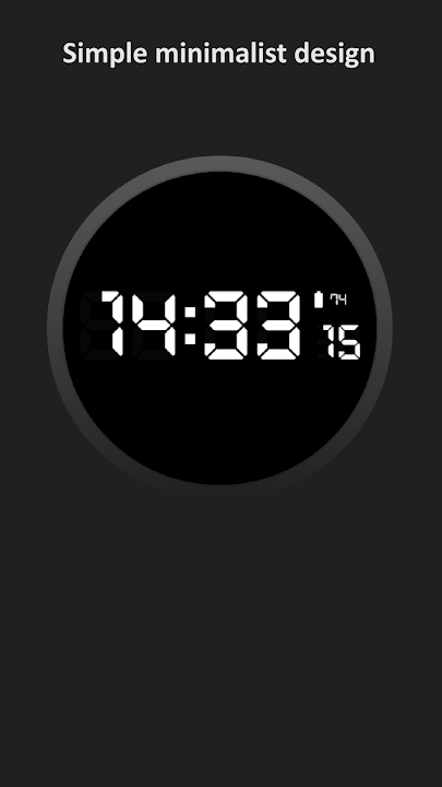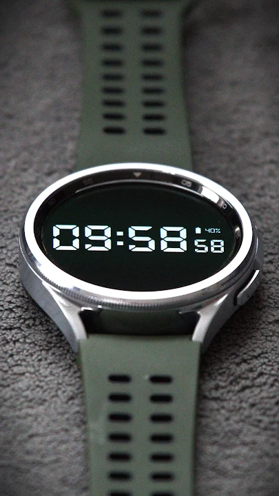 簡潔乾淨的極簡數位 Wear OS 錶盤,靈感來自經典數位手錶。僅顯示時間和電池電量。採用 7 段字體。