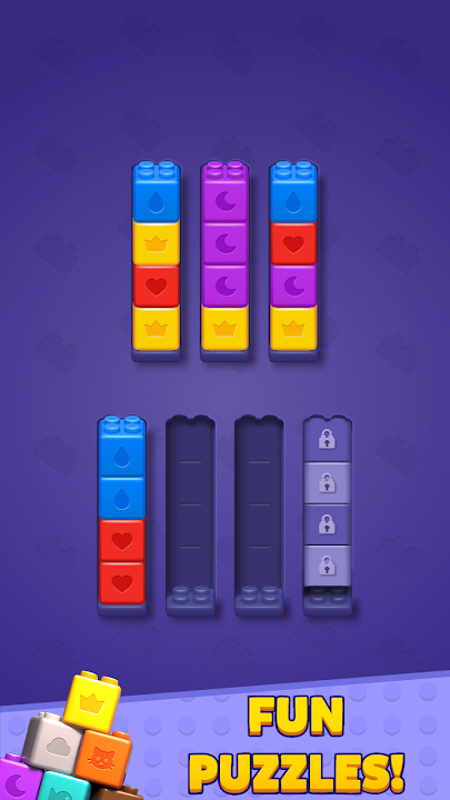 The gameplay is easy to learn, with intuitive tap controls: simply tap on a bottle to pick up blocks and tap on another bottle to pour them in. But be careful—planning your moves is essential as you can't undo them! The key to success is thinking ahead and using your moves wisely.