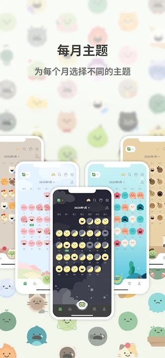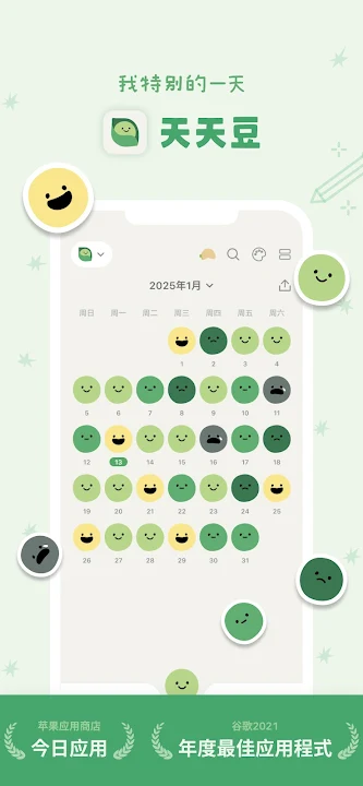 通过五种颜色和表情豆,确认一下我一个月的心情吧。点击豆豆后,可以立即确认当天所记录的内容。