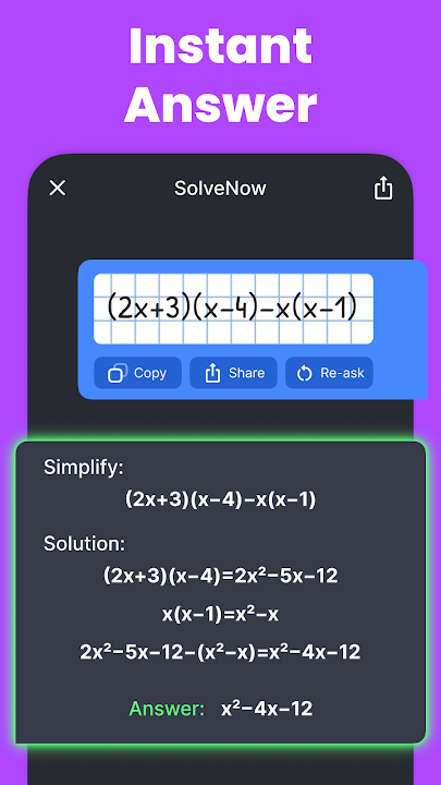 获取答案非常简单:直接在数学题解答器中拍照,即可立即获得答案。这种照片数学解答体验节省时间,减轻压力——就像口袋里有一位私人导师!