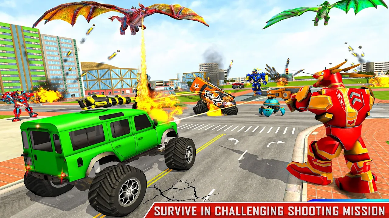 In this robot shooting game, fight for your survival and win the robot wars of robot transforming games. Stand in front of enemies like a pro shooter and kill them to accomplish your mission. Are you excited to view monster truck transformation? If yes, let’s shoot all the evil robot and destroy all enemies in robot shooter games by using your breath fire & shooting power. Transform into monster truck robot and fight and survive till last in the robot war games. Spread your wings and feel free to fly in flying dragon robot games that encloses the excitement of car transforming games.