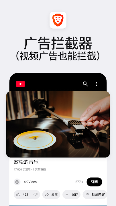 无需外部插件或设置!Brave网络浏览器为安卓提供最安全、最快速的网络浏览器。享受无弹出窗口(弹窗拦截器)、恶意软件和其他烦恼的浏览。
