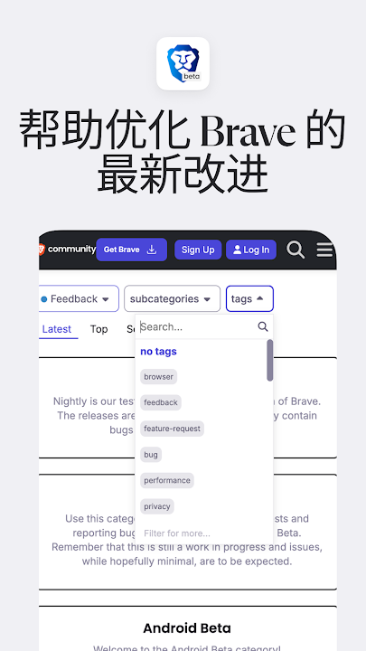 Brave Beta 是 Brave 浏览器的提前发布版本,用于进行测试和监控稳定性