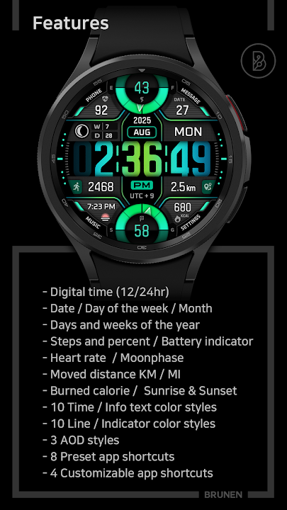 該錶盤是 BRUNEN 為 Wear OS 設計的現代數位錶盤。