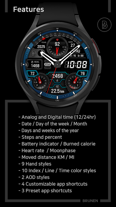 该表盘是 BRUNEN 为 Wear OS 设计的现代数字表盘。