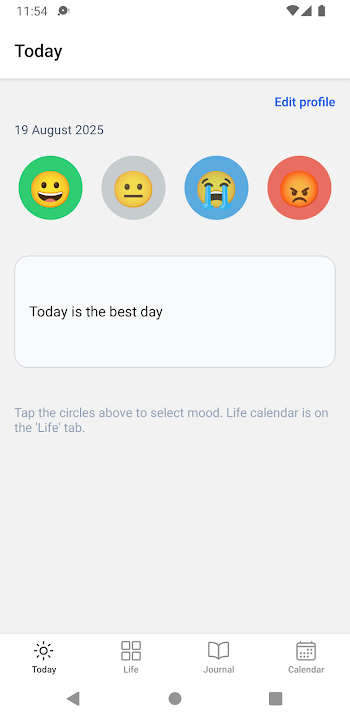 Add short notes to each day to capture important thoughts, events, or reflections. Combine your moods and notes to build a meaningful life diary.