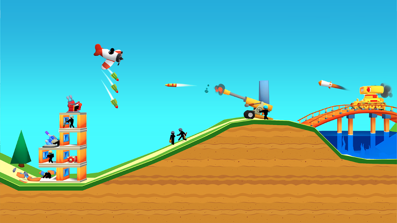 The 3d game is about a stick man on a plane who destroys enemy crowds of armed stick men who are in funny destructible buildings and equipment. They are extremely easy to destroy when you bomb them with air flying shooting bombs or an air cannon.