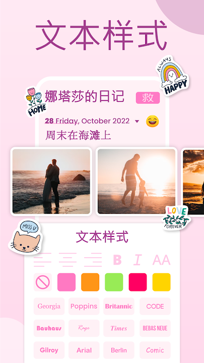 您可以在这款 mi Diario daily journal Diary 应用程序中通过更改背景、文本颜色和字体来精美地自定义您的感受笔记。您可以使用这款 daily bean 我的日记应用程序根据您当前的心情选择表情符号和文本样式。