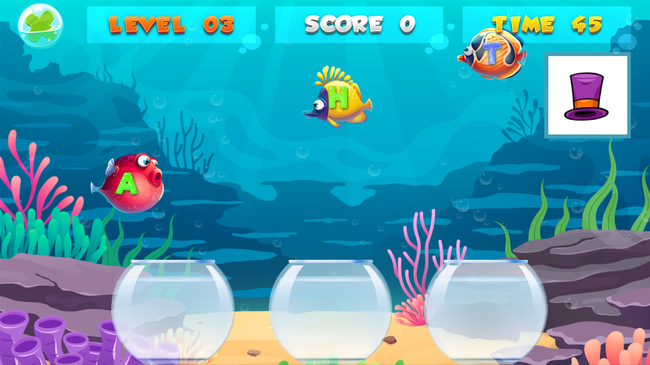 This game is an educational game. Drag and drop the correct fish (letter) into the correct fish tank to create the word before time out.