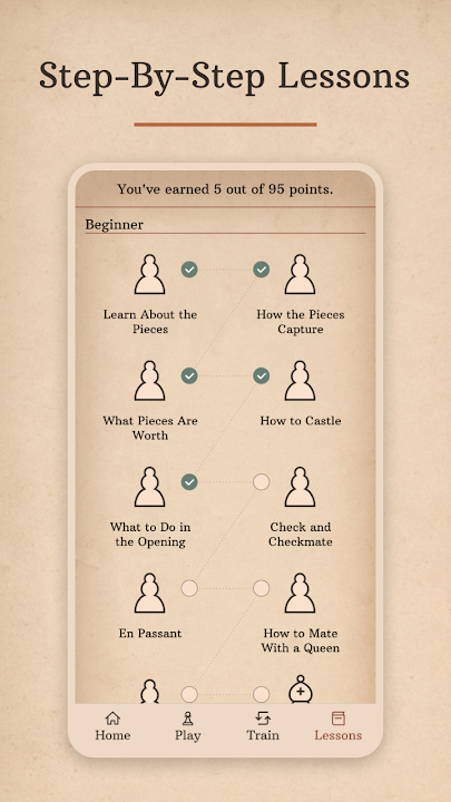 - **全面的国际象棋课程**:超过 50 节互动式国际象棋课程,内容丰富。从基础概念开始,逐步学习高级战略战术,所有课程都旨在提升您的国际象棋理解力和实际操作能力。