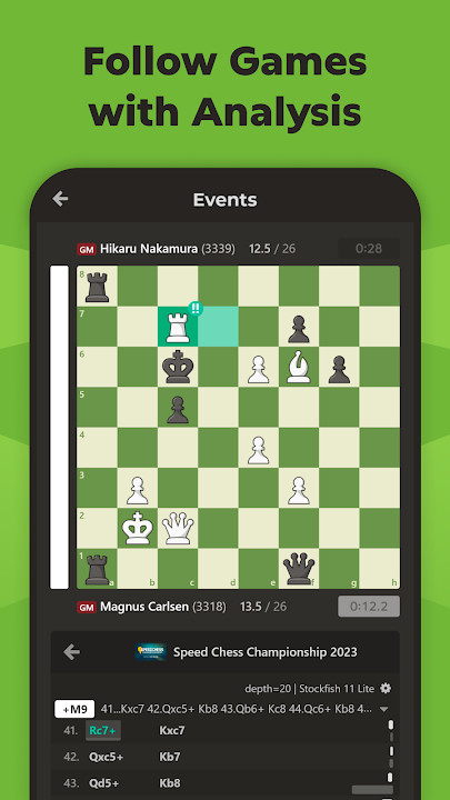 - 现场观看比赛:关注您最喜欢的球员为登顶而战的每一步棋。同时享受世界上最强大的国际象棋引擎对比赛的实时分析。