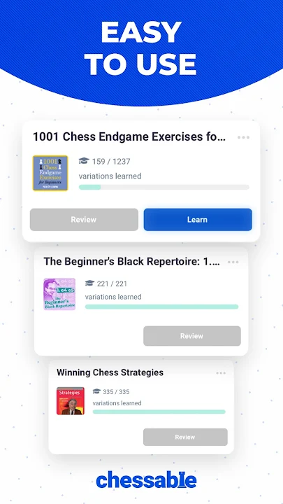 Chessable 是一种以科学为依据的学习国际象棋开局、战术和残局的方法,并能真正记住它们。我们的间隔重复系统适用于初学者和大师,确保您永远不会忘记任何一步棋。