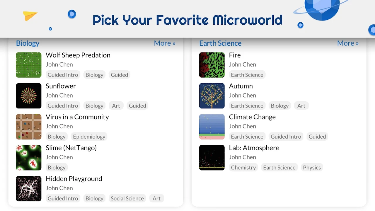 探索解釋海龜宇宙中社會和科學現象的各種微觀世界。您還可以透過使用文字或區塊進行編碼來創建自己的微觀世界,並與全球其他學習者進行討論!