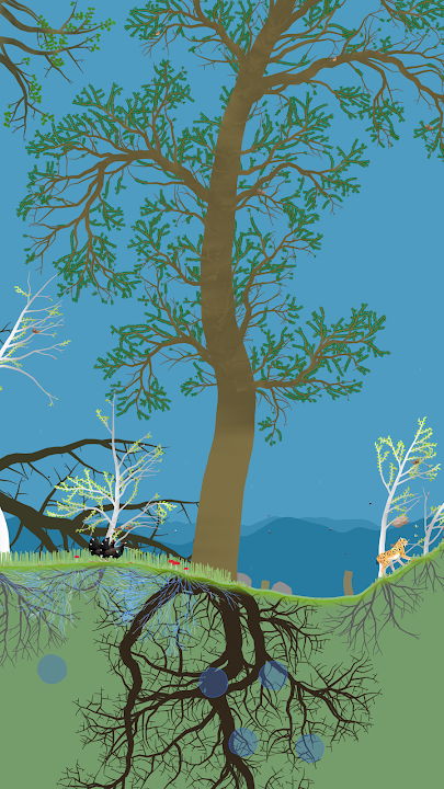 點擊動物會觸發不同的行為,影響森林的生態系:駝鹿排便,為土壤施肥。田鼠啃食樹根,破壞樹木。狐狸會捕獵其他動物。