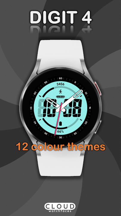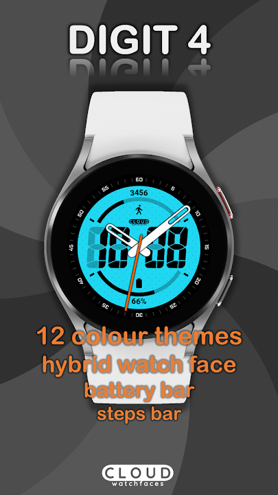 适用于 Wear OS 手表的数字 4 表盘。12 种颜色主题。混合表盘。数字小时和分钟。模拟时、分和秒。电池条。电池百分比。电池充电动画。台阶吧。计步数。享受。