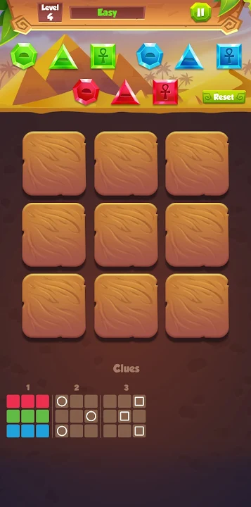 Each level provides several clues which are needed for solving the challenge. The clues are a partial snapshot of the complete logic puzzle and some of them can fit several places in the grid. There is only 1 solution for each challenge, so whenever you place the gems in their correct position, the level will be completed.