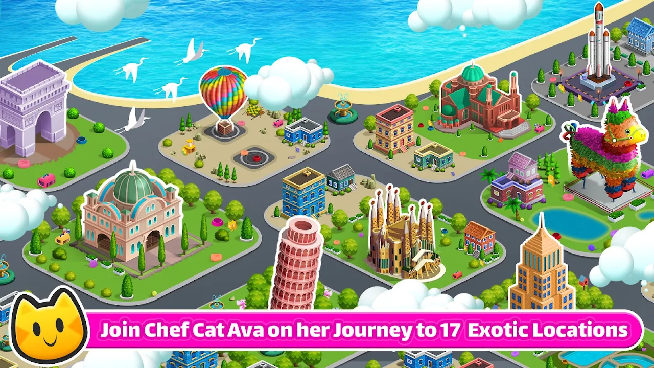 Follow the delicious Meowy Journey of Chef Cat Ava 😺 around the world to 14 exotic locations - Pasta street, Pizza street, BBQ street, Waffle Street, oriental street, bakers street, sandwich street, breakfast street, sushi street, salad bar, bacon street, cafe bar gourmet street and more. Order up, and spread the taco truck craze across the world 🌎 in this new Chef Cat Ava™ Cooking Craze. Expand into a diner or a cafe, and run your delicious kitchen.