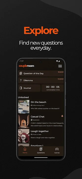 從好玩的調皮遊戲到意義非凡的戀愛測試,Coupleroom 功能豐富,讓每個相伴的時刻變得特別。深入探討有趣的問題,挑戰彼此的膽量,探索彼此的真實想法和感受。讓每個夜晚都成為難忘的回憶。