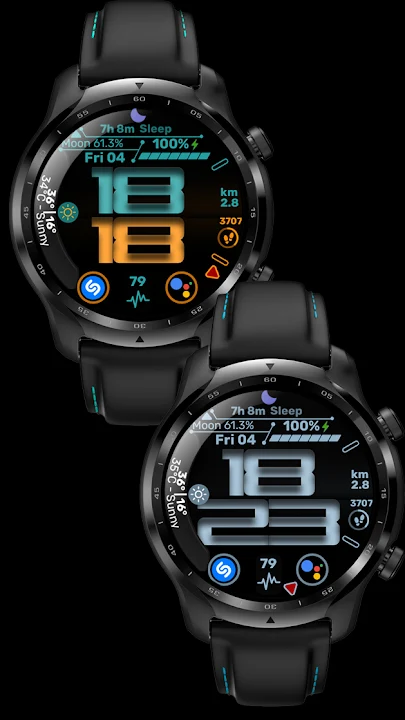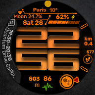 Sleek futuristic watch face with bold numerals, activity stats, and lunar data.