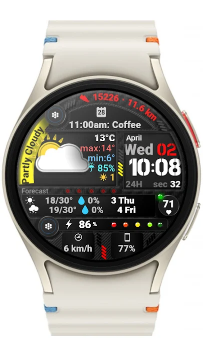 ⚠︎ 此錶盤僅相容於搭載 Wear OS 且 API 等級為 34 以上的 Samsung 手錶,例如 Samsung Galaxy Watch 4、5、6、7、Ultra 等。