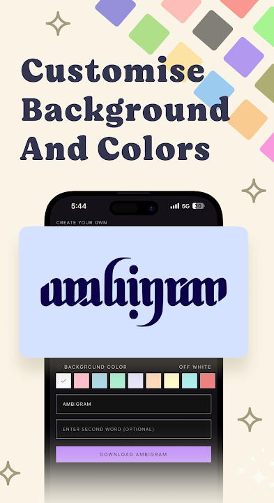 Create ambigram tattoos, customize backgrounds, download & share your art.