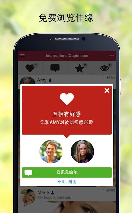 InternationalCupid是信誉卓著的Cupid Media网络的一部分,该网络运营了30多个知名的小众交友网站和应用程序。该国际交友软件是您结识欧洲女性、亚洲单身人士、非洲单身人士和拉丁美洲单身人士的绝佳途径。我们致力于让世界各地的单身人士建立联系,为您带来一个专为国际交友打造的应用程序。
