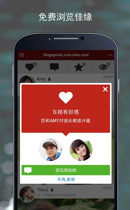 SingaporeLoveLinks是新加坡广受欢迎的交友软件,它让新加坡以及世界各地成千上万的单身男女建立联系,帮他们找到真爱、约会对象和真诚的生活伴侣。我们是一个值得信赖的交友软件,帮助本地和国际单身人士建立联系。如果您想体验真正的交友软件,SingaporeLoveLinks就是您的最佳选择。下载SingaporeLoveLinks移动应用程序,即可在几分钟内创建一个新账号并开始撰写您的爱情故事。立即加入,开始查看交友资料吧!