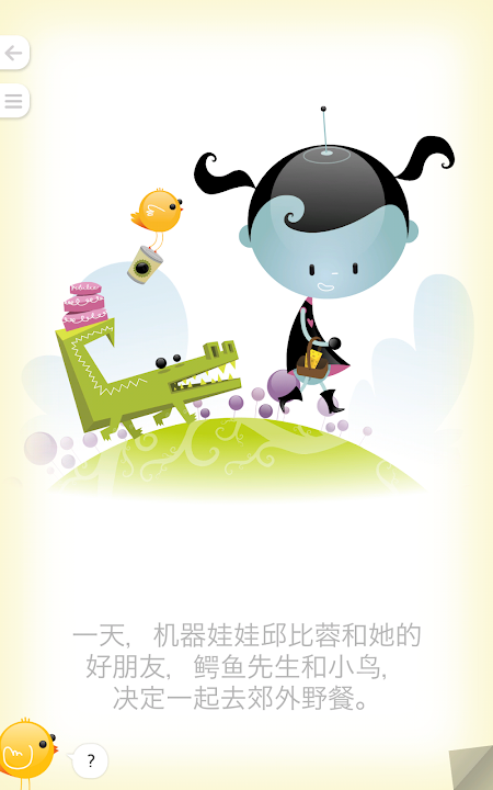 孩子們會玩的非常開心,他們要和鱷魚先生一起在一塊蛋糕上打鼓,和小鳥一起扔橄欖,並和Jubitron一起且奶酪!可選的旁白功能,讓您可以選擇是否為您的孩子大聲讀出故事,或者讓孩子們自己讀故事。點擊故事中任何一個單詞,都會播放該單詞的讀音。這是一個非常棒的輔助工具,可以幫助您孩子的詞彙庫的積累和認知功能的發展。