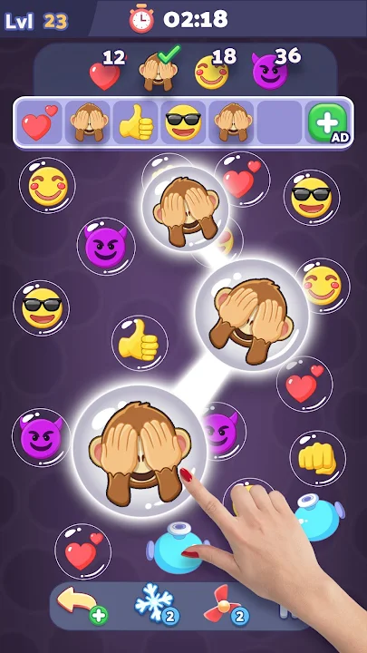 🔵Pop bubbles to add emojis to the tile rack. Three similar emojis on the rack make a MATCH!
