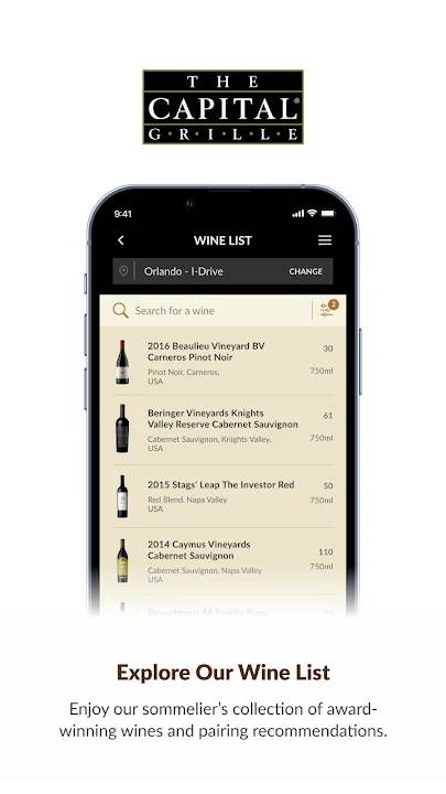 From the moment you download The Capital Grille Concierge app, the experience is one of service at your fingertips. Seamlessly make a reservation with only a few taps, explore Food and Wine Pairings from our Sommelier, view a live up-to-the-minute Wine List, peruse public Wine Lockers or manage your Wine Locker with ease, and so much more.