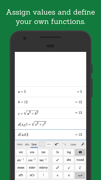 - View multiple expressions at once. Unlike many scientific calculators, all of your previous work remains visible on the screen.