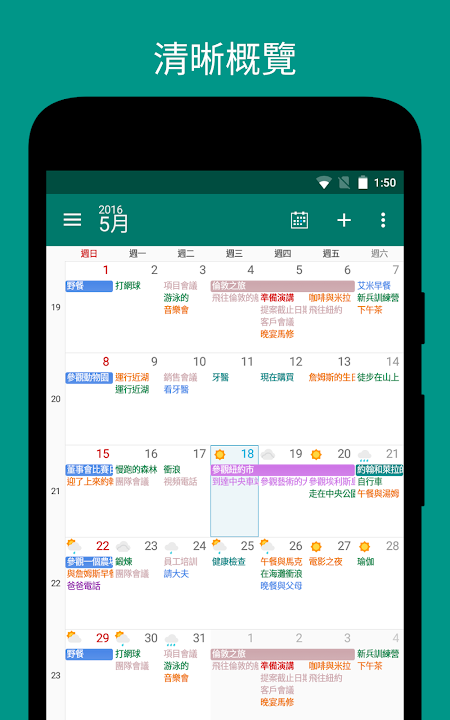 使用日、星期、議程、月份、文字月份、清單和年度的視圖組織管理您的忙碌計畫