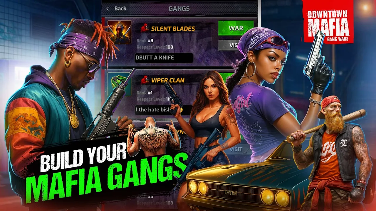 * Equip your gang with arsenals and fight for dominance in real-time wars.