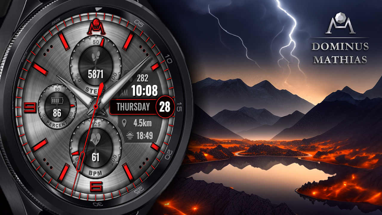 Dominus Mathias 为 Wear OS 设备精心打造的表盘。它包含所有最相关的复杂功能/信息,如数字时间(小时、分钟、秒、上午/下午指示器)、日期(工作日、星期几)、健康、运动和健身数据(数字步数和心率)、可定制复杂性和捷径。公司的徽标/品牌名称位于该表盘的顶部。欢迎您从许多令人愉悦的色调中进行选择。